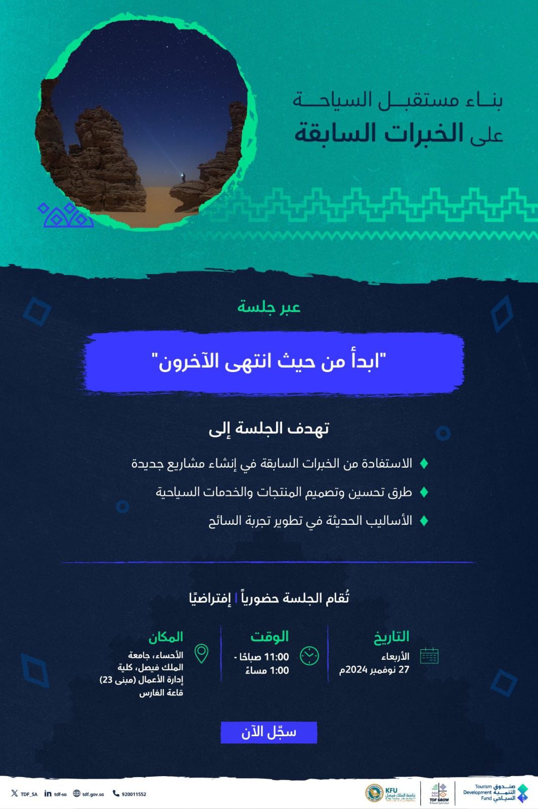 ينوي صندوق التنمية السياحي ممثلا بمركز نمو السياحة، بالتعاون مع كلية إدارة الأعمال بجامعة الملك فيصل، عن إقامة جلسة مميزة تحت عنوان "ابدأ من حيث انتهى الآخرون"، وذلك يوم الأربعاء المقبل، في مبنى 23، قاعة الفارس يلقيها الدكتور أحمد العمير