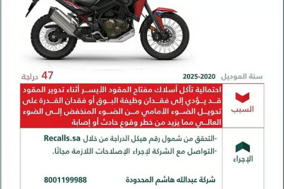 أعلنت وزارة التجارة استدعاء 47 دراجة نارية من نوع (هوندا - CRF1100) من موديلات الأعوام 2020 إلى 2025؛ لاحتمالية تآكل...